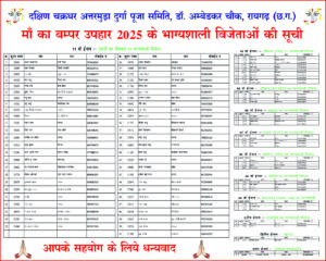इस वर्ष के प्रथम पुरस्कार टाटा पंच कार के भाग्यशाली विजेता दिव्यांश मेरावी (चक्रधर नगर) बने, जिन्हें मुख्य अतिथि ओ.पी. चौधरी ने कार की चाबी सौंपकर सम्मानित किया। द्वितीय पुरस्कार बुलेट मोटरसाइकिल जगदीश गुप्ता (गांजा चौक) के नाम रही।तृतीय पुरस्कार एक्टिवा स्कूटी विनय पटेल (छुहीपाली) और अर्णव सा (बिलाईगढ़, ओडिशा) को प्राप्त हुआ। अन्य विजेताओं को क्रमशः फ्रिज, वॉशिंग मशीन, स्मार्ट टीवी, कूलर, ट्रॉली सेट, मिक्सर ग्राइंडर और चांदी के सिक्कों से सम्मानित किया गया।