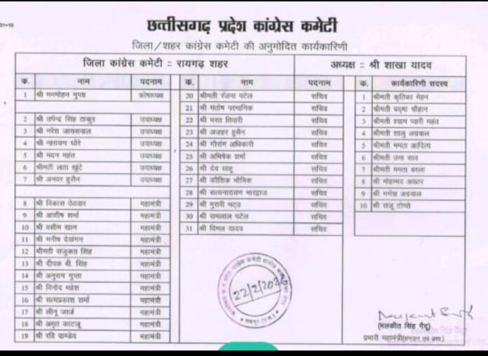 छत्तीसगढ़ प्रदेश कांग्रेस कमेटी के अध्यक्ष दीपक बैज ने जिला कांग्रेस कमेटी रायगढ़ के अध्यक्ष शाखा यादव द्वारा प्रस्तावित कार्यकारिणी सूची को अनुमोदन प्रदान कर दिया है। अनुमोदन के बाद नई जिला कार्यकारिणी की औपचारिक घोषणा कर दी गई।