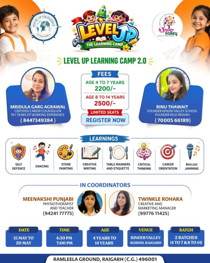 रायगढ़। आधुनिक दौर में बच्चों को केवल किताबी ज्ञान ही नहीं, बल्कि बदलते समय के साथ कदम से कदम मिलाकर चलने के लिए लाईफ स्किल्स की भी सख्त जरूरत है। इसी उद्देश्य को साकार करने के लिए शहर के प्रतिष्ठित ‘किण्डर वैली स्कूल’ के तत्वावधान में ‘लेवल अप लर्निंग कैम्प 2.0’ का भव्य आयोजन 15 मई से होने जा रहा है।