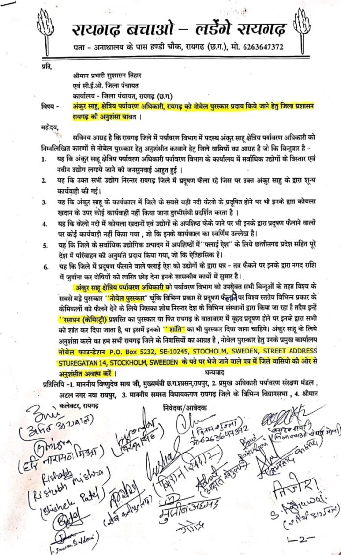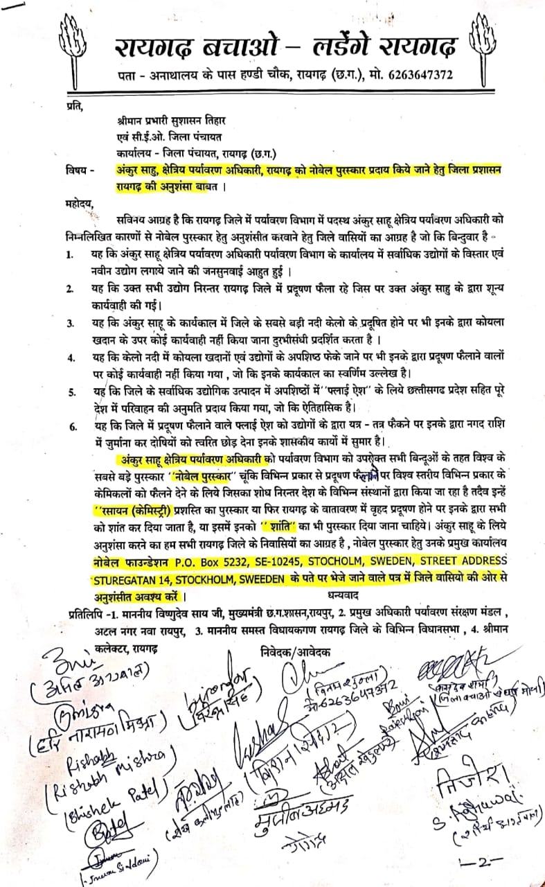 रायगढ़ बचाओ-लड़ेंगे रायगढ़ के विनय शुक्ला,बासु शर्मा,शेख कलीमुल्ला,शमशाद अहमद,अक्षत खेड़ुलकर,ऋषभ मिश्रा,मुजीब अहमद,तिजेश जायसवाल,योगेंद्र यादव, अभीषेक पटेल,शौर्य अग्रवाल,किशन सिदार,इनाम सिद्दीकी,हरि मिश्रा,आकर्ष शर्मा,अनिल चीकू आदि सहित सैकड़ों लोगों के हस्ताक्षर युक्त ज्ञापन छत्तीसगढ़ शासन के “”सुशासन तिहार”” के अंतर्गत संबंधित कार्यालय में जमा किया है।जिसमें यह बताया गया की भयानक और अनगिनत कारणों से प्रदूषण रायगढ़ शहर और जिले में इसका जिम्मेदार कौन है?यह निश्चित नहीं हो पा रहा है पर इसके लिए छत्तीसगढ़ शासन का पर्यावरण संरक्षण मंडल का रायगढ़ स्थित कार्यालय निरंतर बस कुछ कर रहा है।इसके प्रमुख अंकुर साहू क्षेत्रीय पर्यावरण अधिकारी ताबड़तोड़ 23 के लगभग जनसुनवाई करवाई जो कि हर महीन 1 के लगभग जनसुनवाई आहूत रायगढ़ जिले के “”केलो”” नदी से कुछ किलोमीटर दूर पर उद्योगों की स्थापना, वृद्धि कारण और कोयला खदानो के लिए हुई जो कि प्रदेश में सर्वप्रथम स्थान के रूप में इनका प्रयास सूचीबद्ध हो गया है।इन प्रदूषण फैलाने वाले कोयला खादानो और उद्योगों से फैलने वाले विश्व स्तर के जहरीले रासायनिक पदार्थ की उपस्थिति रायगढ़ के वातावरण के साथ जल,जंगल और जमीन में मिल रही है।इसके कारण रायगढ़ जिला वैज्ञानिकों और रसायन शास्त्र में अध्ययन करने वालों के लिए सर्वप्रथम शोध का केंद्र बनता जा रहा है और “”नोबेल पुरस्कार”” देने वाले स्वीडन की संस्था भी रसायन के लिए नोबेल पुरस्कार प्रदाय करती है तो प्राथमिकता और हक से अंकुर साहू को इसके लिए पुरस्कार मिलना चाहिए।