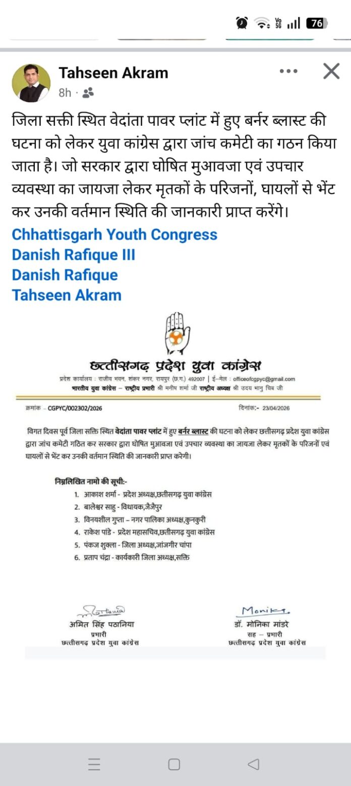 घटना के बाद जहां एक ओर प्रशासन और कंपनी प्रबंधन पर सवाल उठ रहे हैं, वहीं दूसरी ओर पीड़ित परिवारों में भारी आक्रोश और शोक का माहौल है। हादसे की गंभीरता को देखते हुए प्रदेश युवा कांग्रेस अब इस मामले में एक्शन मोड में आ गई है। छत्तीसगढ़ प्रदेश युवा कांग्रेस द्वारा घटना की निष्पक्ष जांच और पीड़ितों को न्याय दिलाने के उद्देश्य से एक जांच समिति का गठन किया गया है। यह समिति सरकार द्वारा घोषित मुआवजा एवं उपचार व्यवस्था का जायजा लेने के साथ-साथ मृतकों के परिजनों एवं घायलों से मुलाकात कर उनकी वर्तमान स्थिति की जानकारी जुटाएगी।