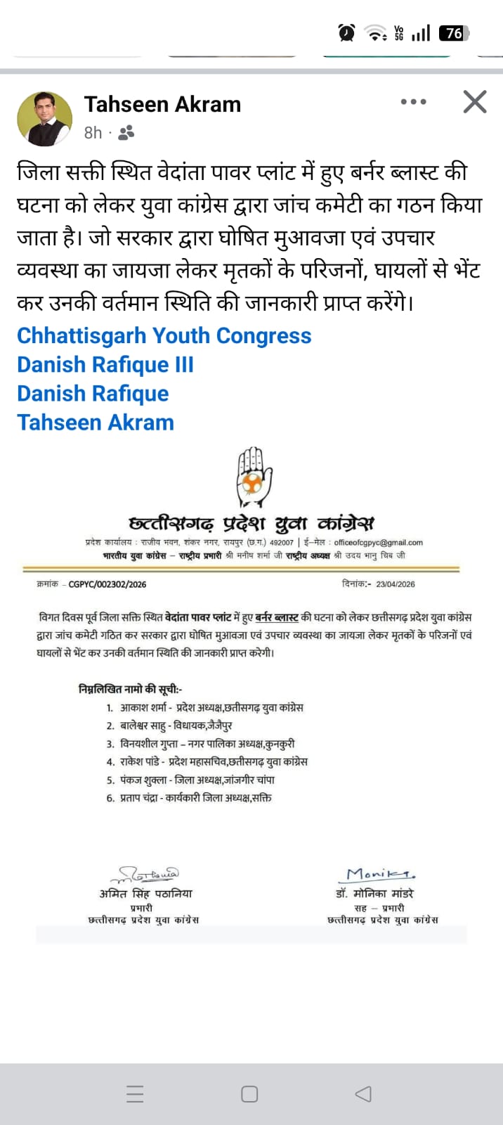 वेदांता पावर प्लांट हादसा …प्रदेश युवा कांग्रेस ने बनाई जांच कमेटी….पीड़ितों से मिलकर करेगी सच्चाई उजागर